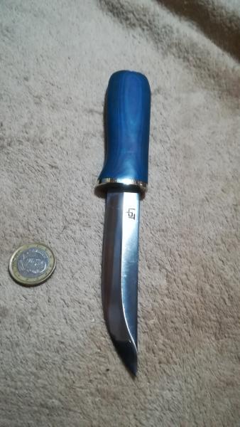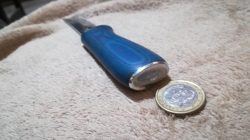Muestro aquí este puukko que acabo de terminar en micarta azul, con pomo y guarda en plateado. La hoja es una LauriPT con temple diferencial (63HRC en el filo), de 9,5 cm de largo y 3,25 de grosor, con vaciado scandi y pulida. El cabo es pequeño, de 8,6 cm de largo, lo que lo hace muy portable pero cómodo de usar.