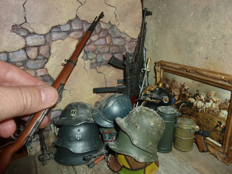Pues si mal montaje todo mentira, inocentada interesante, aparte de la diversidad de cascos que encima caen sobre el maravilloso lienzo, los cargadores puestos y sin embalar y entre casco y casco una gorra de tela., y la pared de cartón piedra o simple foto.