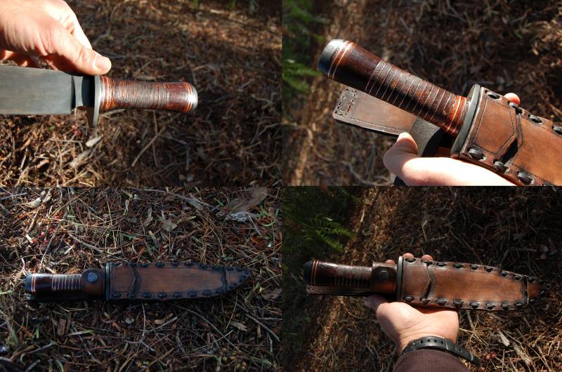 El cabo está hecho sobre la enorme espiga del cuchillo, y es a base de cuero, 4 separadores de cobre, madera de amaranto y cuero decorado con hilo de cobre (me gusta el cobre :lol: ).