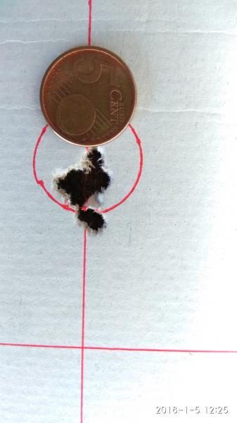 Actualmente suelo tirar con balines JSB de 16 y 18 grains del cal 22. Pero los HN Sniper Magnum de 18 grains me gustan mucho más en cuanto a precisión el problema es que a la hora de cargar cuando empujo el cerrojo le cuesta un poco entrar el balin y no se si eso dará lugar a posibles averías que es lo que menos quiero. No sé cuál será el motivo ya que tanto los JSB como los HN son del mismo subcalibre 5.52. les dejo una diana con cada uno de ellos para que los vean. Cada diana tiene un cargador completo . Un saludo
