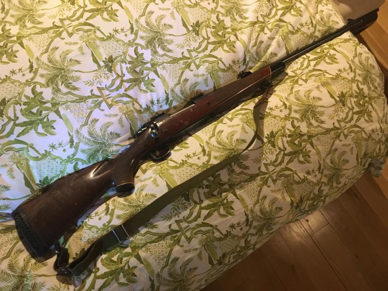 Es un modelo 70 antiguo, no el moderno de fibra, lo entrego con funda de cuero, mira telescopica FALKE (no se aumentos porque esta borrado) y municion, creo que 2 o 3 cajas...