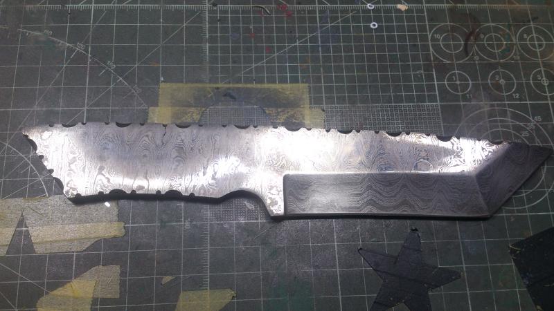 No te puedes fiar. El color negro lo da la oxidacion de un material (puede ser acero o hierro) y el color "acero" se da por un acero (este si) que tiene menos contenido en carbono que el otro material, con lo que aguanta la oxidacion mejor (se oxida menos o nada) al ser sumergido el cuchillo en un acido debil. Una manera de averiguar si son o no acero los dos materiales y la calidad del mismo es por su dureza con un medidor. A partir de 57-58 HRC ya tienes un buen cuchillo. Hay que medir tanto en el patron oscuro como en el claro, porque no van a tener la misma dureza al ser materiales distintos.