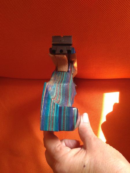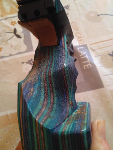 El arma esta en Cartagena, Murcia y la empuñadura no esta retocada, solamente le puse unas tiras adhesivas de fieltro para amortiguar el hueso del dedo gordo, como se ve en la fotografía y limpiar la madera que no lo he hecho.
