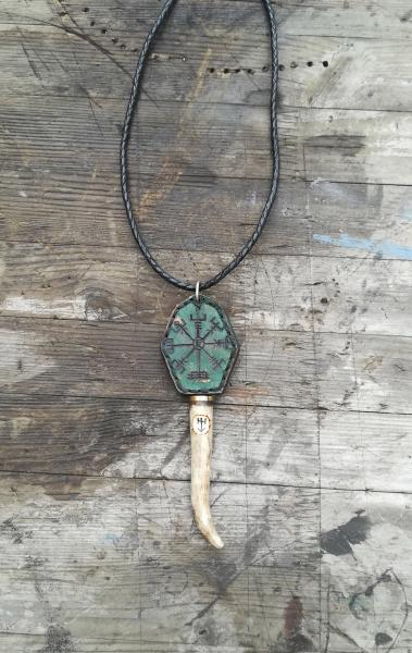 Van pirograbadas. Una, con un motivo decorativo. La otra, con Vegvísir, el compás solar y la runa Raido (o Raidha) en el centro (más alusiones al viaje...)