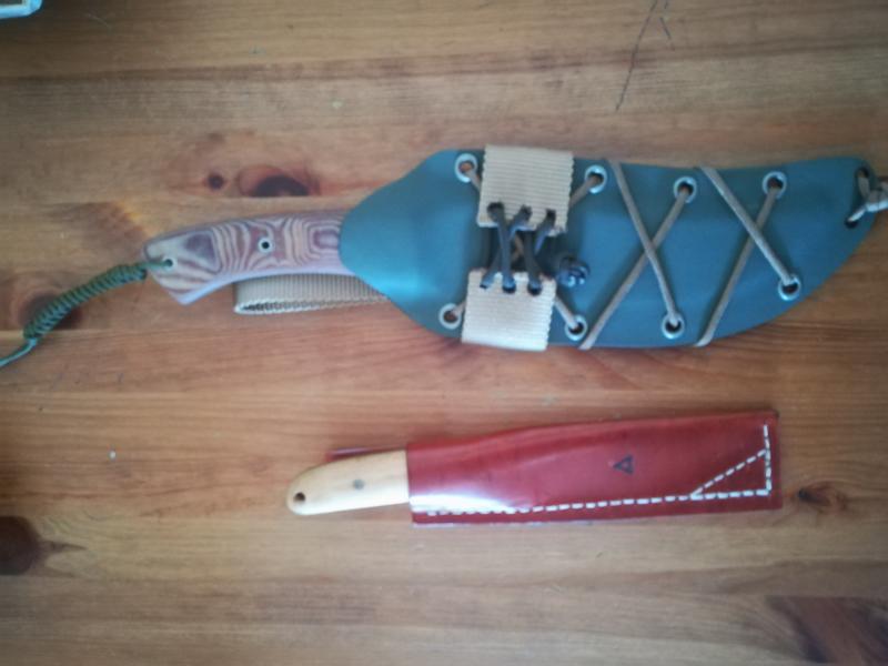 se vende o se cambia esta pareja de cuchillos el grande mide 19 de hoja en acero inox espiga conificada muy comodo en la mano y el otro mas pequeño es forjado en acero 9260 tiene una hoja de 11cm es un cuchilla 3 mm de espesor para mas fotos o detalles os dejo mi email alfonsoromerorojo@gmail.com