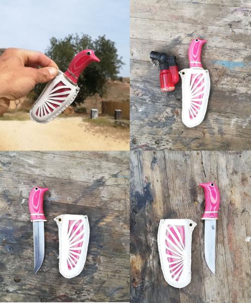 Hola. Hice un cuchillo de medio cabo, al que le dí una forma que mejorara el agarre. Y parecía una cabeza de pájaro. Así que, por no quedarme en medias tintas, le puse un agujero para el cordón en posición de ojo y una funda con forma :) Así que salió este cuchillo. La funda es tipo saya, de micarta, rígida como el cabo, pero va enfundada en cuero blanco.