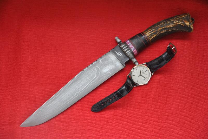 este tiene unos 25 cm. de hoja por 4,5cm. de ancho y 6mm. de grosor, la guarda es de laton , separadores de fibra v. y aluminio y el cabo palosanto y una roseta de ciervo. como veis todos los que os he enseñado estan tratados con percloruro,mas adelante os ire enseñando algunos mas