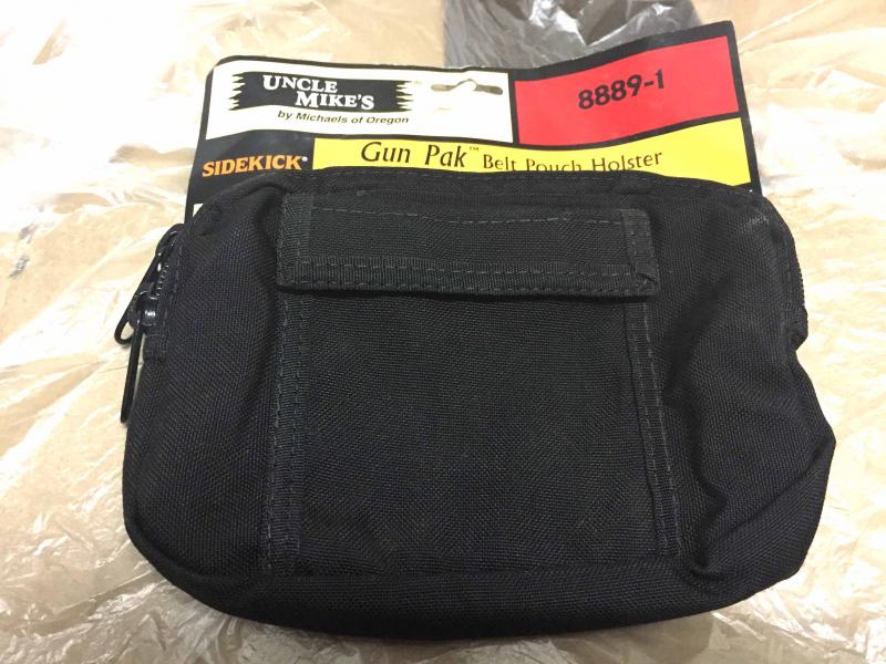 Oferta, nuevo a estrenar, pack riñonera para llevar arma corta, de tamaño compacto o semicompacto o revólver de 3", a mano sin que nadie lo aperciba. Ideal para profesionales y para verano. Color negro. Se fija al cinturón. Marca estadounidense Uncle Mikes. Mide 20x14 cm el exterior. 20 euros