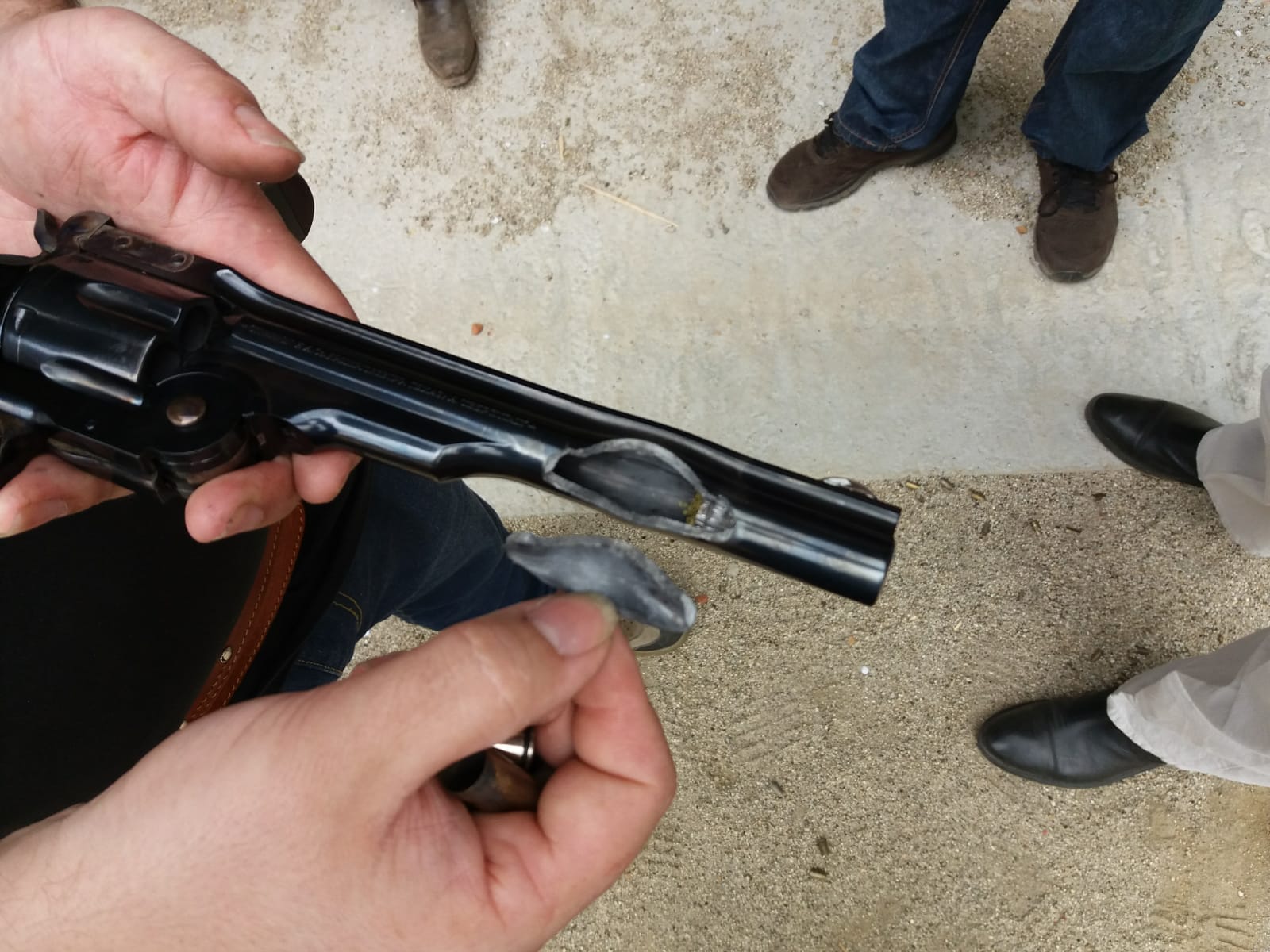 El amigo vacio el tambor entero; 1 ok, 2 falla, 3 hernia el cañon, 4 revienta la hernia y sale por el lado, 5 y 6 salen hacia el lado por el agujero del 4...