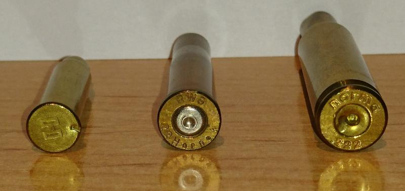 Unas vainas de los tres 22 Magnum 22 Hornet y 222 Remington.