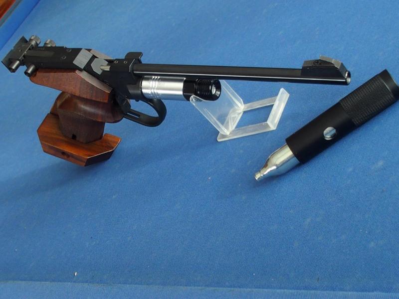 La pistola en cuestion es una Walther CP2 super-precisa con la peculiaridad de que se incluye un adaptador de capsulas de 12 gr con contrapeso, lo que permite utilizarla perfectamente sin depender de las bombonas de CO2 tradicionales (se incluyen las 2 suyas). Con las baratas y pequeñas capsulas de 12 gr. disponemos de unos 80 disparos. En el maletin que se ve en la foto se incluyen 10 capsulas de 12 gr. y 500 balines de competicion ademas de los elementos necesarios para el mantenimiento. El mecanismo de disparo totalmente personalizable es extraible sin necesidad de desarmar la pistola.