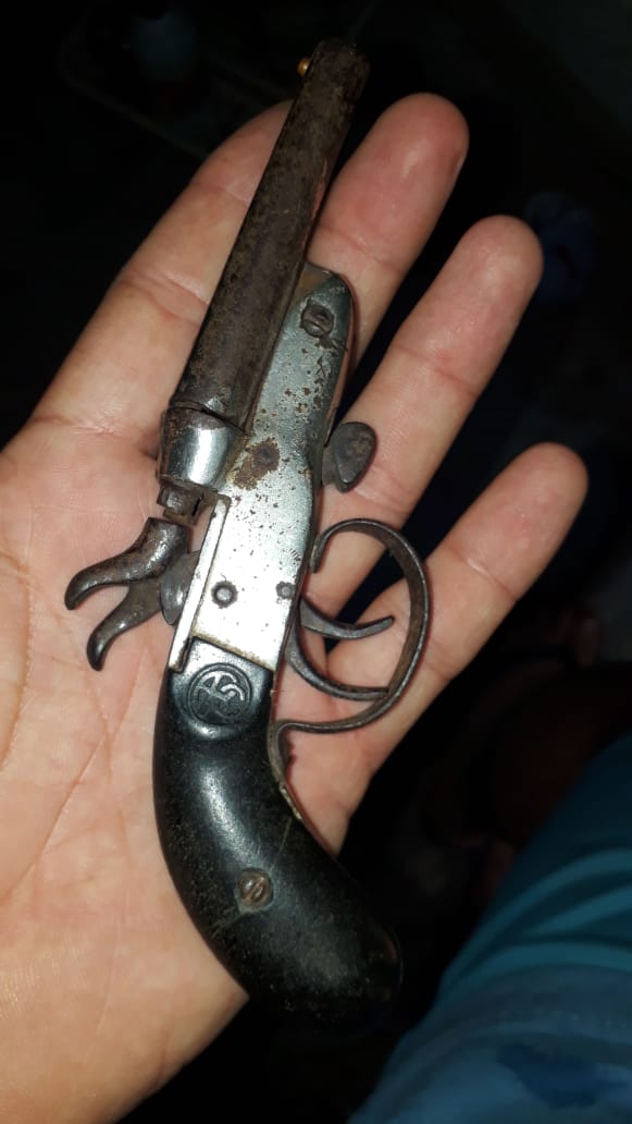 Es una pistola de dos cañones de fuego central y anima lisa. Por su estado diria que eibarresa, aunque tambien se fabricaban en francia y sobre todo Belgica. Disparaban los cartuchos de 9 mm y las mas grandes incluso el 12 mm. Tambien he visto que las habia del .22 (cartuchitos) pero no se si en fuego central o anular.