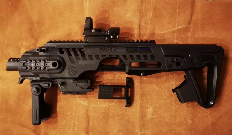 Tiene guardamanos delantero plegable y extraíble, raíles Picatinny en ambos lados y zona superior para colocar visores, linternas o punteros, culatín extensible con soporte para cargador extra y diseño compacto.