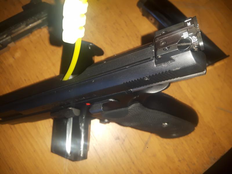 Vendo mi Pistola cz 75b de 9mm con 2 cargadores de capacidad de 15 cartuchos, mas el kit kadet 2 calibre 22lr con dos cargadores con capacidad de 10 cartuchos. Tiene alzas regulables LPA en los dos carros. La pistola tiene un poco la pintura desgastada en zona de la corredera en el 9mm donde el alza, roces minúsculos como se aprecia en la imagen. el reten de la corredera de 9mm esta cambiado y todavía no le hecho ningún disparo, se rompió esta semana y me gaste 50 euros en el.