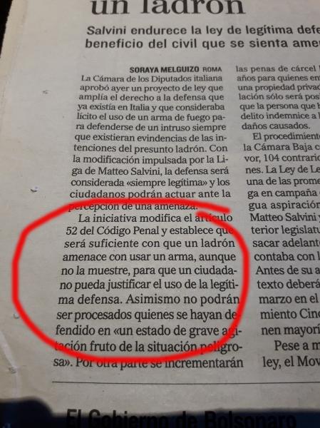 Armas.es: En España no existe el derecho a la autodefensa, sino una eximente total o parcial ante una responsabilidad penal. En otros países europeos, como Italia, existe el derecho de tener un arma (pistola) en casa para la autodefensa y su nuevo Gobierno se plantea ampliarlo. También, el nuevo presidente de Brasil, ha anunciado medidas de este tipo.