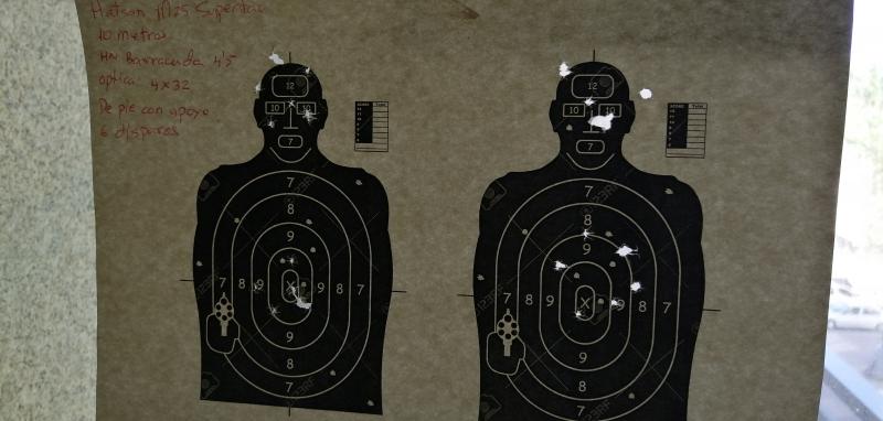 Como muestra dejo unas realizadas con mi hatsan M25 supertac vortex 4.5, a 10 metros en interior, Hn barracuda, posición de pie con apoyo y óptica 4x32.