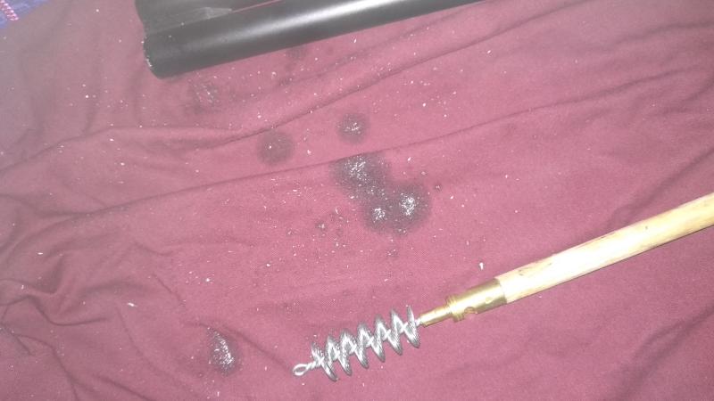 Que más me gustaría que fuesen virutas de pólvora sin quemar, pero al pasar el bore snake salieron y eran de plomo. En los cañones se ve marcado perfectamente las estrías/marcas de por dónde han pasado las balas.