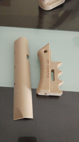 Buenas pues os dejo unas fotos de el grip , la rabera y carrillera de la impact impresos en 3D con filamento de madera, tintados y lacados .