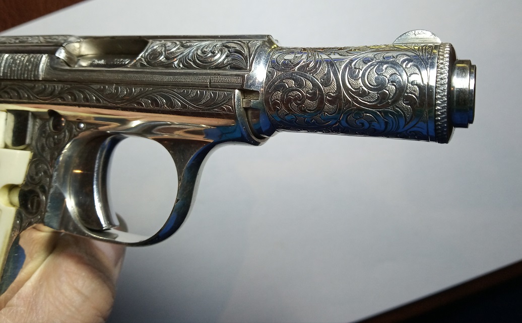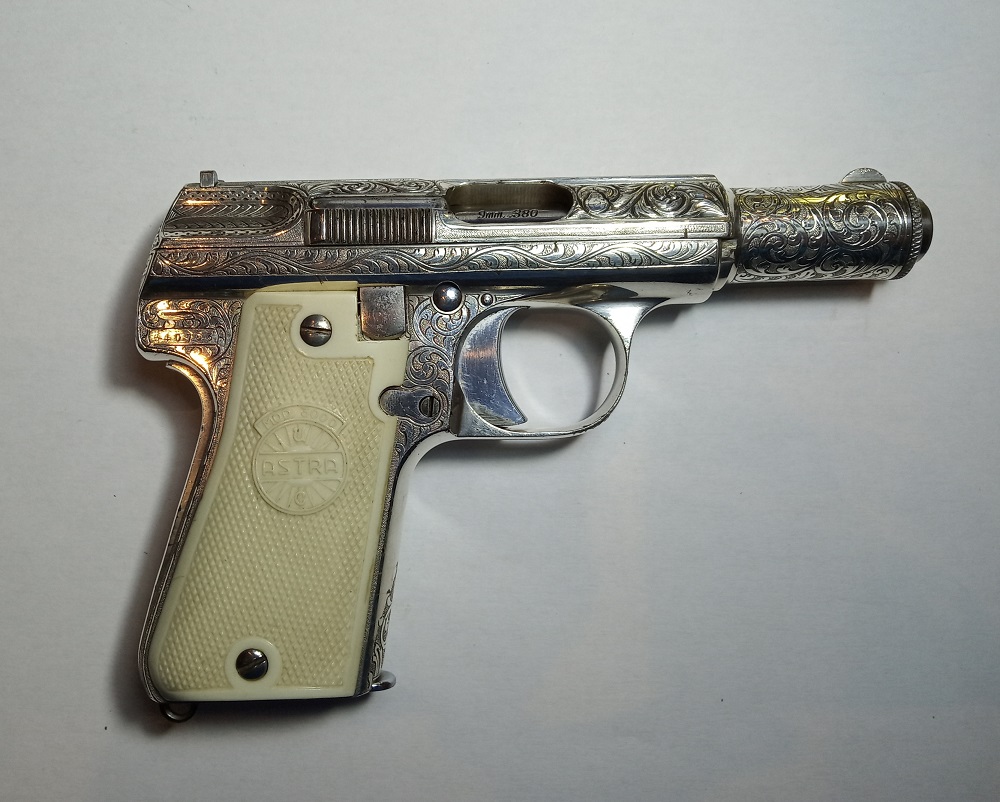 Hola compañer@s. He decidido poner a la venta una pieza de mi coleccion bastante rarilla, es una Astra 3003 de 1946, su estado es impecable, con sus cachas originales y solo unas muy leves faltas de plateado que se pueden ver en las fotos, las 3003 no son buriladas, son cinceladas, llevan un grabado muy profundo, esta virtud que las embellece en extremo tambien es un defecto, al ir tan ahuecadas en algunas partes del armazon se producen puntos debiles, os digo el por que de esta explicación, en la corredera la zona donde acaba la parte cilindrica tiene dos pequeñas grietecitas, en una de las fotos las señalo, en alguna ocasion alguien le puso municion fuerte y se ocasiono este fallo.