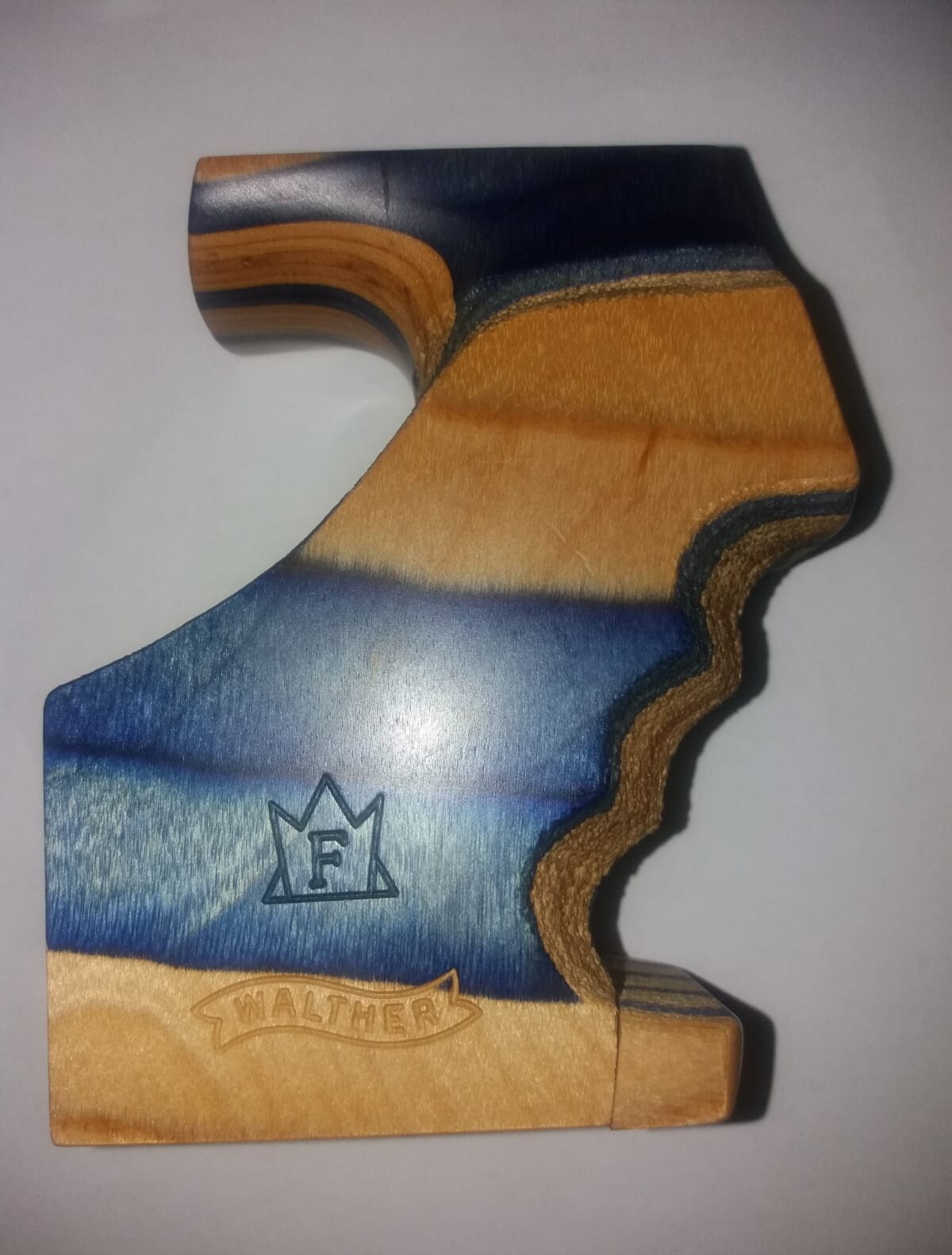 Cacha de madera anatómica, laminada, ZURDO con vetas azules, muy cuidada y con poco uso, original de pistola walther gsp 32, TALLA M. Gastos envio incluidos