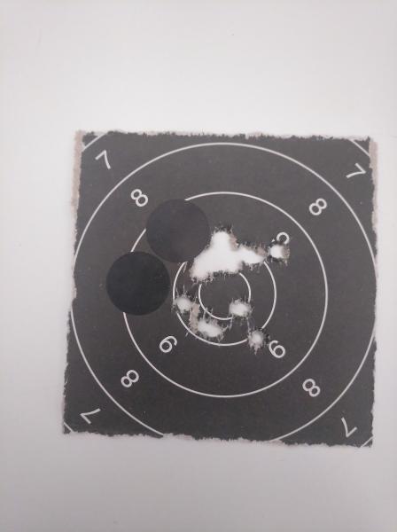 Este blanco es a 100 metros en posicion tendido, sin apoyos. El primer tiro alto por no dejar una pequeña luz entre el punto y la base del negro. Los otros cuatro...que decir, satisfacción pura. Imagino que apoyado, el grupo será bastante mas homogéneo y cerrado
