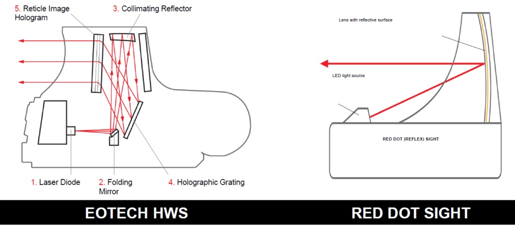 Para ser un visor holográfico y generar una proyección holográfica, ha de crearse primero una holográfía, que es una imagen 3D generada por lásers, para luego ser proyectada donde sea conveniente, bien en el mismo aire, bien en una pantalla. Esa proyección se realiza mediante técnicas de interferencia entre haces láser, permitiendo generar imágenes muy claras y bien definidas, con mucha precisión, cosa que no se consigue igual con la basada en leds.