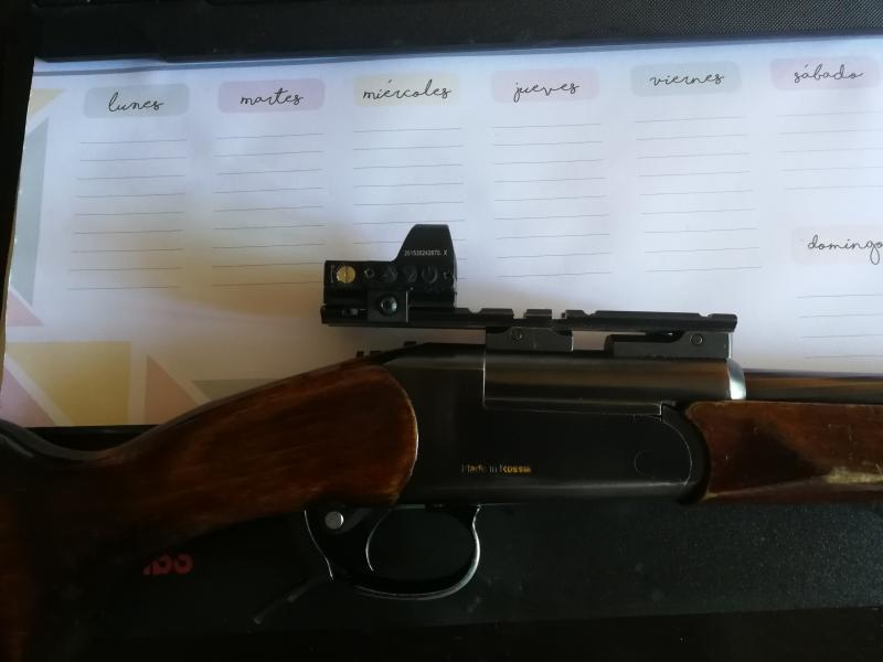 Es un monotiro, pero si te apetece usar un punto rojo o cualquier visor con monturas tipo "weaver" tambien tienes este adaptador.