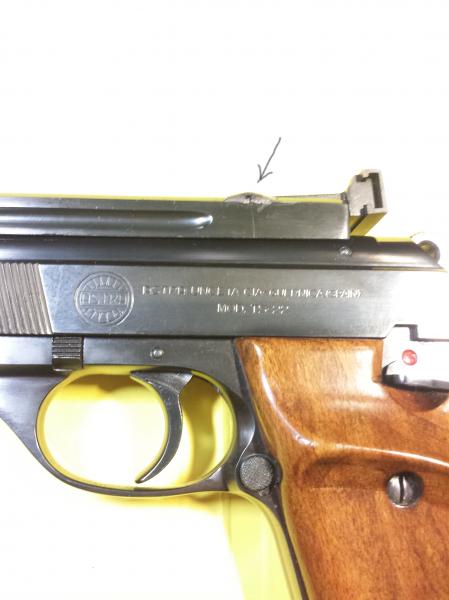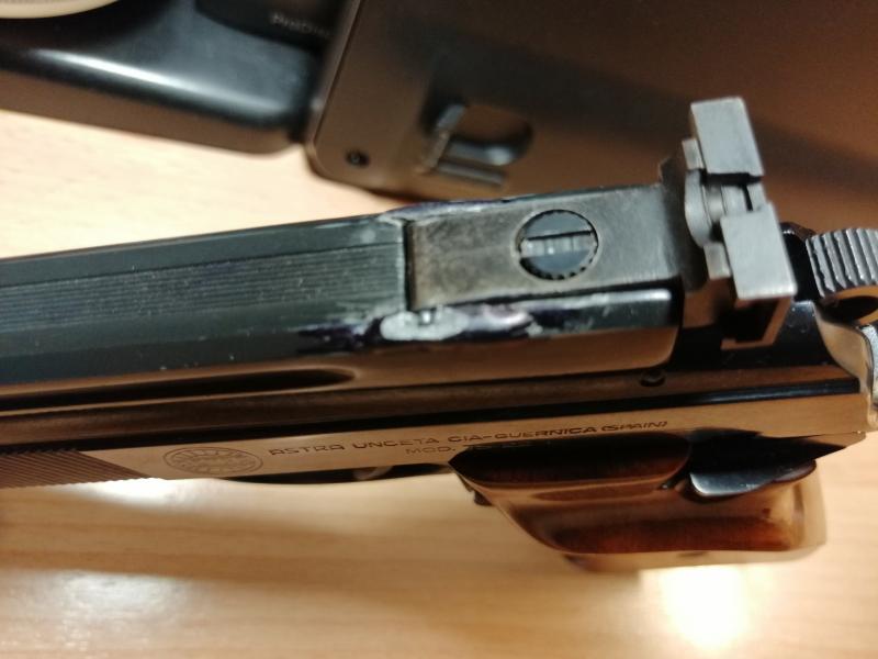 El arma funciona bien y esta en muy buen estado. Pero tiene roto el soporte izquierdo del eje del alza. Adjunto foto con el detalle.