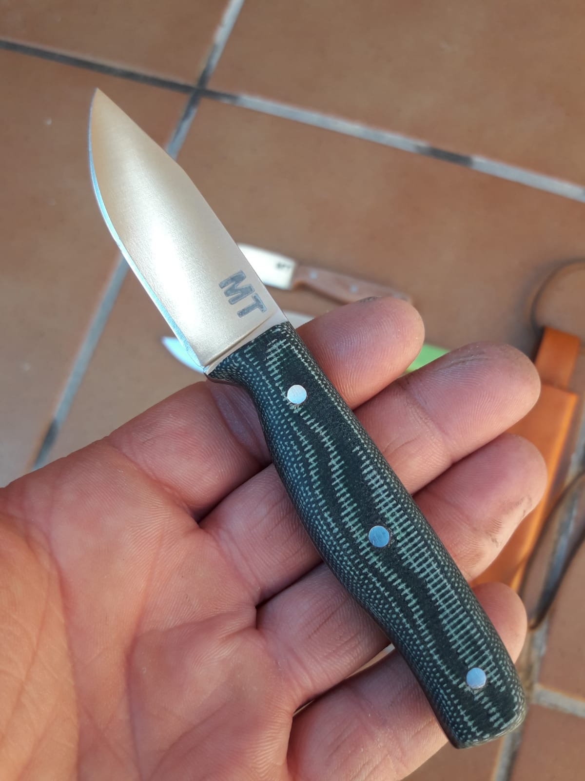 Mensaje del artesano: Aqui os dejo unas fotos de mi nuevo diseño el modelo "Grillo" , se trata de un cuchillo chiquitito de cuello fabricado con acero inox de buena calidad (Bohler N690Co ) y cuyas medidas aproximadas son 7cm de hoja y 8cm de mango 2cm de anchura y 3mm de grosor, vaciado plano hasta el lomo y remaches de inox. de momento dispongo de estos acabados , respectivamente de arriba a abajo : micarta verde chillona, G10 negro , G10 marron, micarta verde y micarta marron . La funda es tanbien artesanal fabricada por mi en cuero de 3mm de grosor y con cordon de paracord para cuello incluido en el precio.