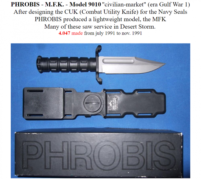 Ese tipo de cuchillos de espiga roscada, salto a la fama, por la década de los 80, tanto que incluso lo usaron los SEAL, durante una corta temporada, el PHROBIS, y se oxidaba y rompía la espiga por la corrosión del agua salada........