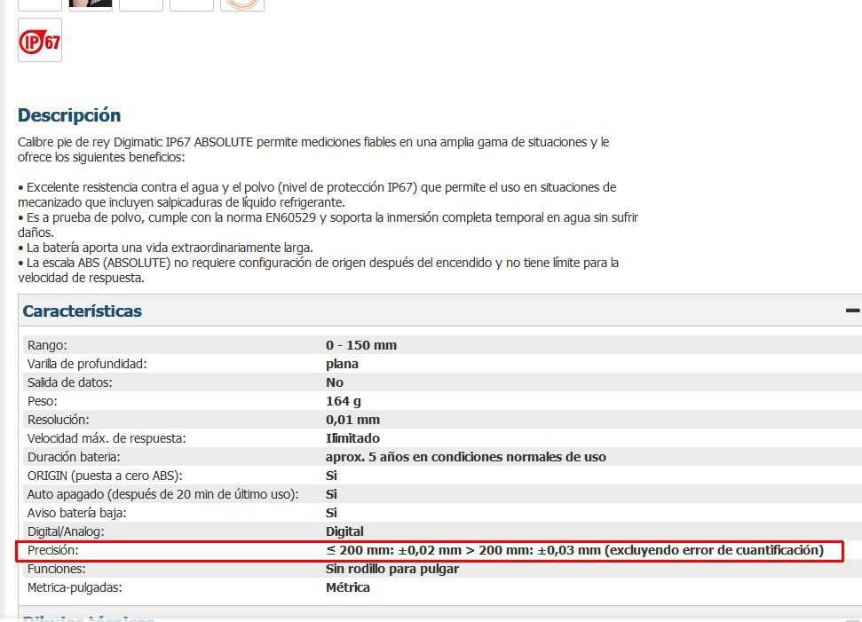 Pues, en la página de Mitutoyo, si es este Absolute Digimatic, tiene una Precisión: ≤ 200 mm: ±0,02 mm.