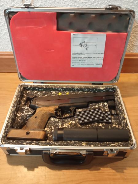 Pistola Gamo Compact, adaptada para silenciador (se sujeta con imanes), con maletín y contrapeso.