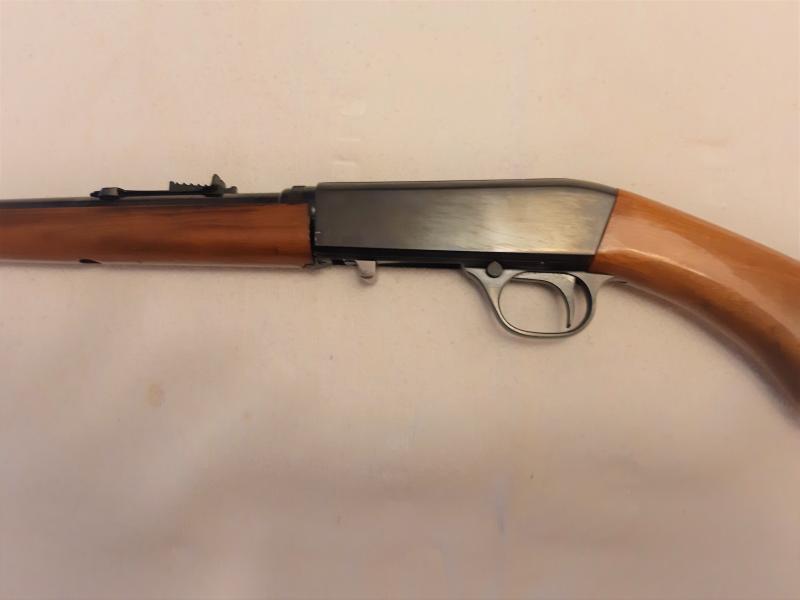 Carabina del calibre 22 l.r. de la casa BROWNING, fabricada en Bélgica. La carabina es de las primeras desmontables en dos piezas con calidad. Se carga mediante un tubo que lleva en la culata, y tiene una capacidad de 11 cartuchos del 22 largo. Es antigua, pero no tiene ningun defecto y funciona muy bien, se entrega con una funda, su precio es de 200 eu. ya que es un modelo bastante especial....