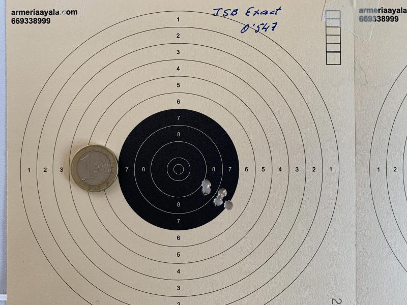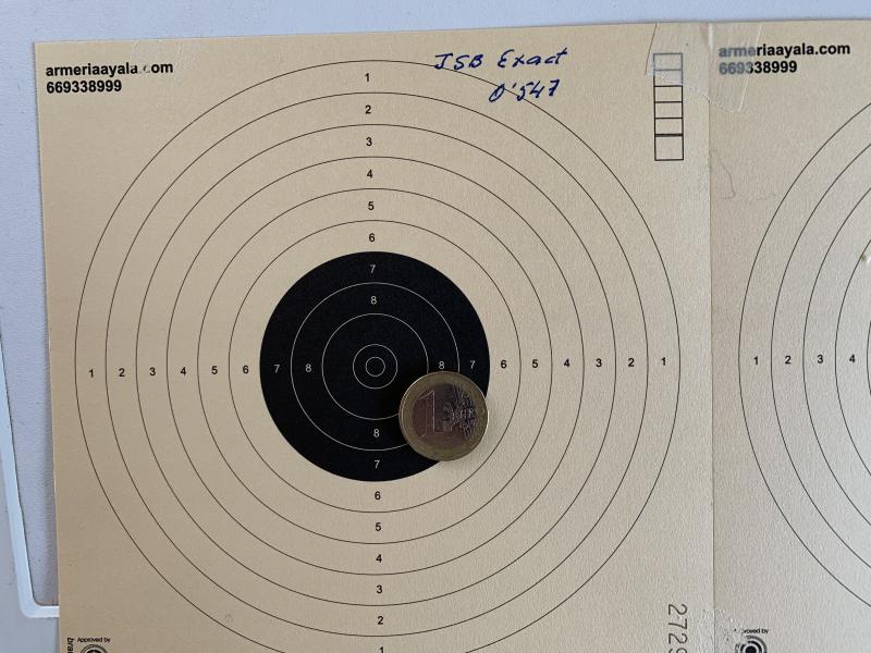 He disparado al aire libre, a la distancia de 25 metros, con miras abiertas ( de momento no quiero poner visor )y he tenido que ahumar las miras ya que tenía el sol de cara y no veía un pimiento. Hay dos balines que son el JSB Exact de 0,547 y el JSB Heavy de 0,670,.que a mi parecer han destacado mas que los otros, la agrupación se puede tapar con una moneda de euro.