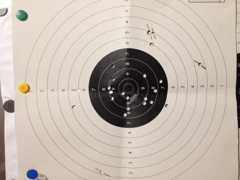 Descontando los 4 primero tiros (marcados) hasta ajustar el alza, todos al negro menos 4 bien cercanos y una agrupación mejor que buena, teniendo en cuenta que no paso de 480 en estandar y que era la primera vez que tiraba con ellos.