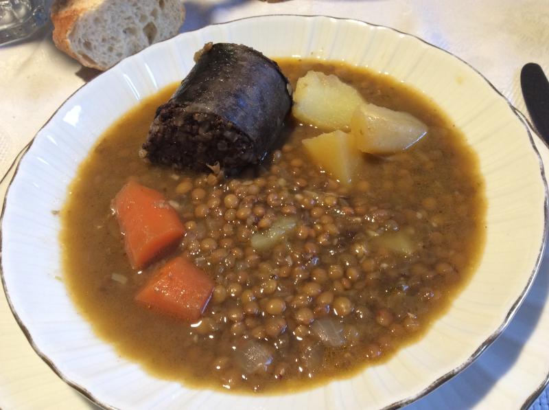Lentejas de Tierra de Campos y morcilla de Villarcayo, todo de Castilla la Vieja, como me enseñaron de pequeñito...