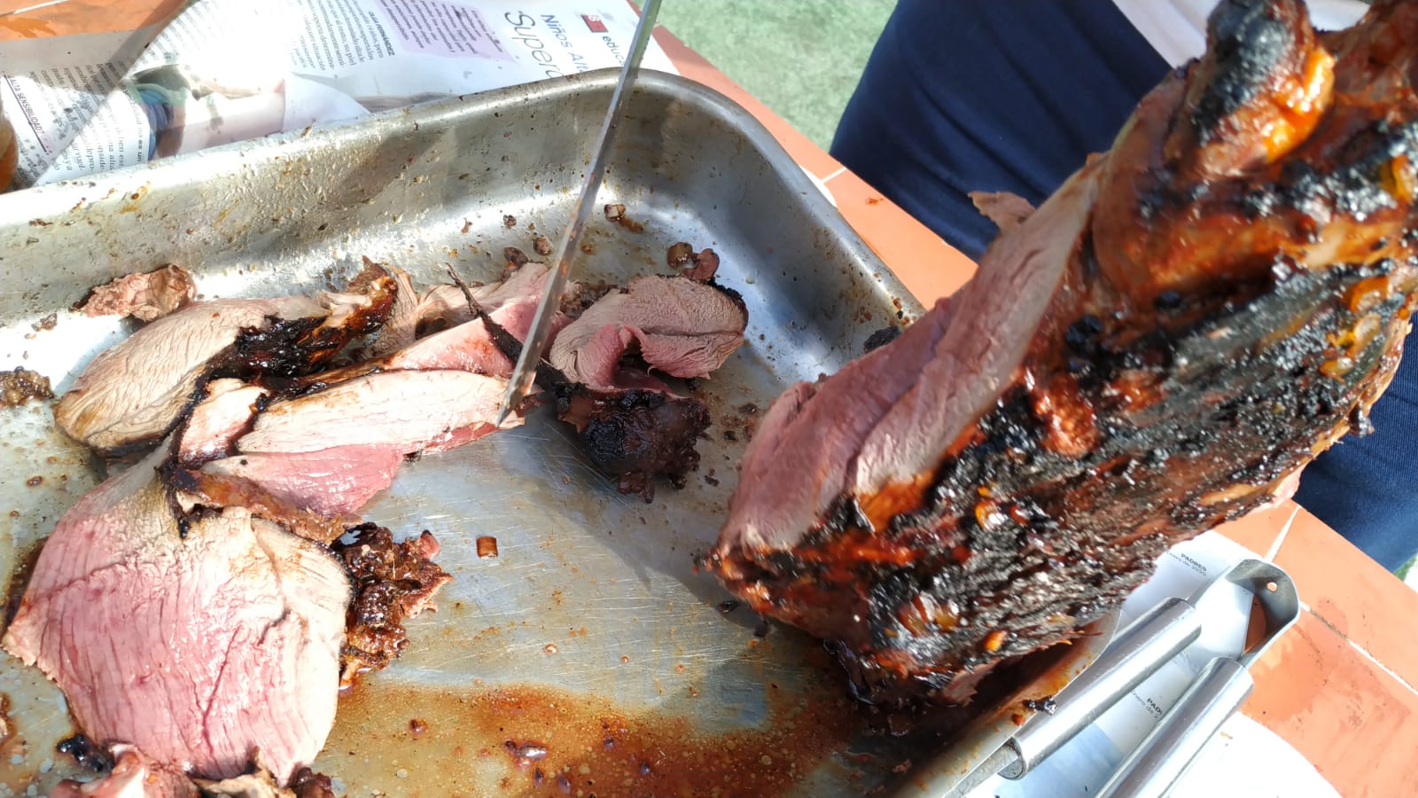 En la bbq cuando ya tenía las brasas metí las piezas envueltas en el papel de plata a la parrilla y lo tuve como una hora dándole las vueltas a las piezas. A la hora o así quité el papel de plata y volví a poner salsa bbq y lo mismo, dandole vueltas hasta que estaba, cuando ya estaba más o menos lo corte, las costillas las volví a poner y vuelta y vuelta. Y con la paletilla igual, cortada finita y vuelta y vuelta. También hice medio costillar con salsa chimichurri y quedó genial.