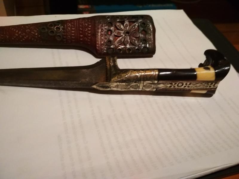 No soy un experto ni mucho menos, pero con mis 60 tacos me recuerda una daga del norte de África, pues recuerdo vagamente que me enseñó algo parecido un militar español que estuvo destinado allí.