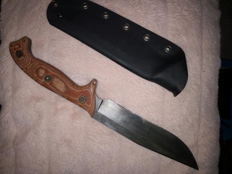 Cuchillo artesanal hecho por Juan David (JD knives) realizado en acero al carbono o1 hoja de 18 cm y 6 mm de grosor mango en micarta marrón y funda de kydex separadores negros su precio 130 envío incluido