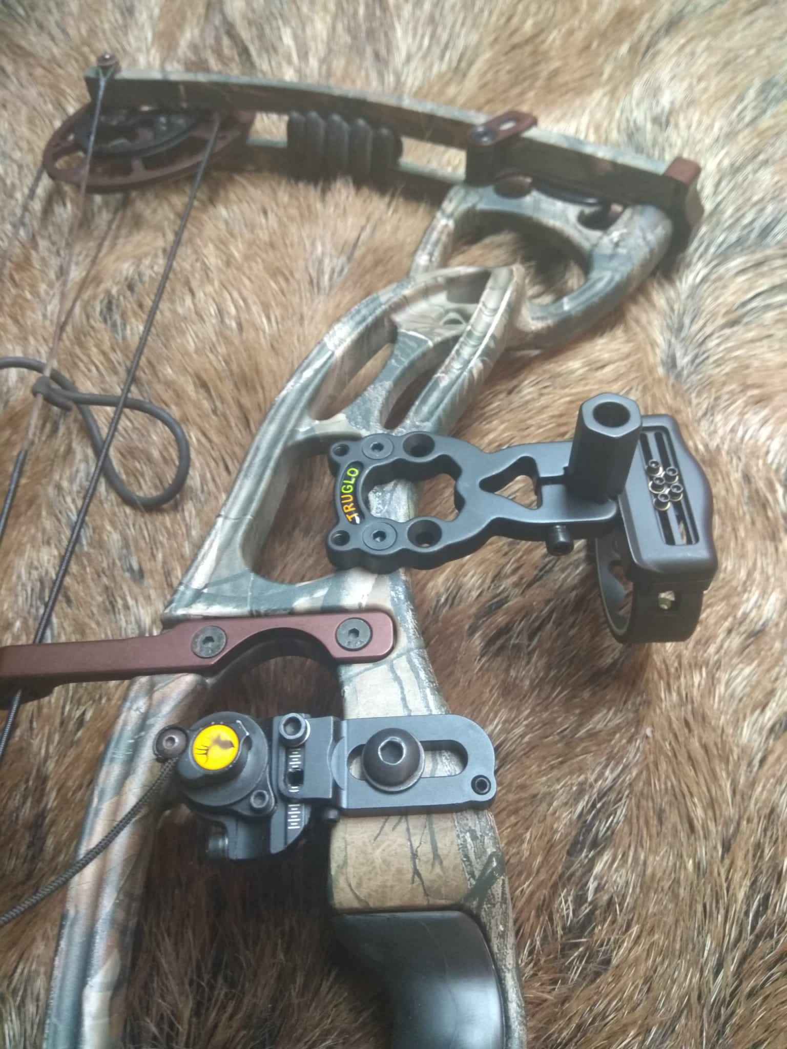Visor truglo con pines iluminables para tiros nocturnos o con poca luz. Reposaflechas de caída incluido que sujeta la flecha puesta sin que se caiga o se mueva para luego caer y que salga la flecha sin tocarlo para mayor precisión de vuelo. Peep de caza instalado con goma alineadora para que cuando se abra siempre esté derecho para poder alinearlo con el visor y apuntar correctamente.