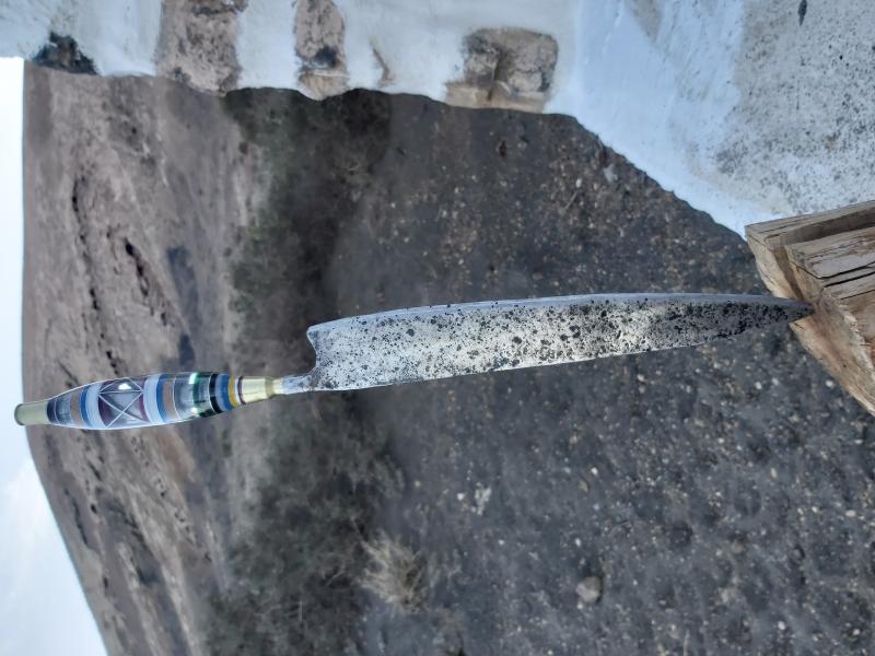 Estupenda herramienta. No sé que hace de longitud la hoja, pero robusto y con presencia. Por el encabado sencillo pero eficaz, y el tratamiento de la superficie de la hoja recuerda en parte a mi macho riojano de Azote, el que colgué al principio de la tira. Cuchillos al natural, sin concesiones de ningún tipo.