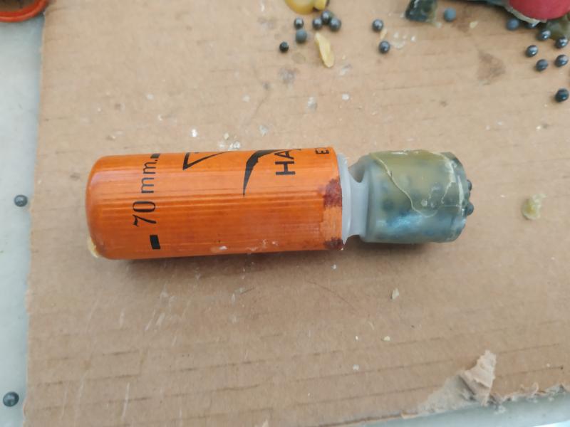 tras personallizar el invento empleando cera depilatoria y unos cartuchos de carton cortados para contener un taco de copa de plastico he procedido a rellenarlos con la amalgama de cera y perdigones ( nº6) para de este modo poder analizar que ocurre con el procedimiento y las conclusiones han sido: