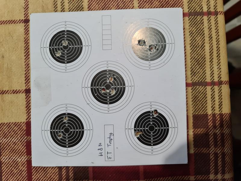 Adjunto fotos de las agrupaciones. La parte superior de la diana esta donde el * "asterisco" redondeado en la parte superior de las dianas. La más abierta fue mientras iba corrigiendo el alza a 5 m. y la otra a 10 ya corregida. Agrupar agrupa, pero no se si a 20 metros me quedaré sin alza para corregir, que opináis?