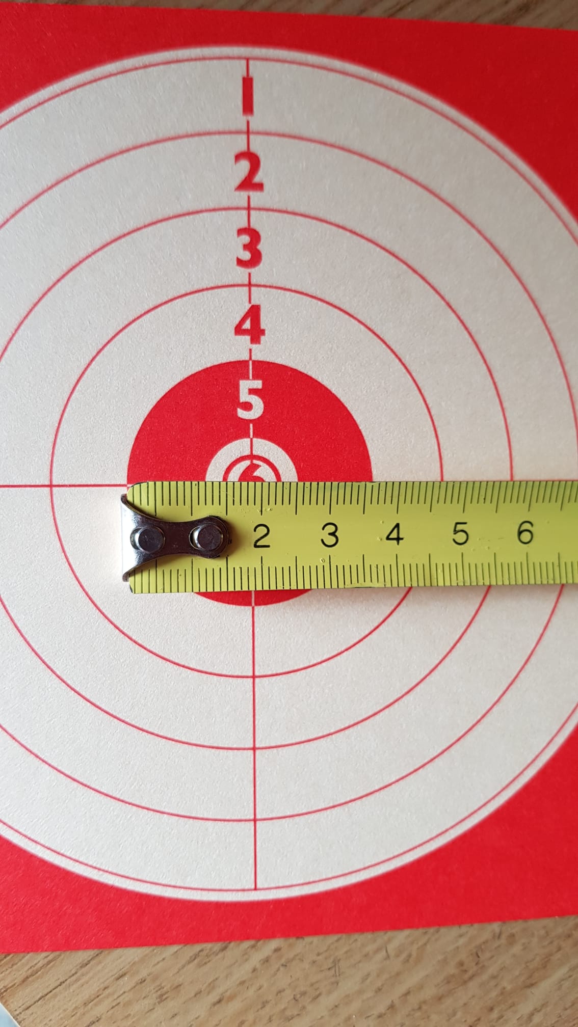 Empiezo a.disparar y lo primero que observo es que a pesar de dar bajo y a la.derecha " 5cm. a la derecha y unos 8 abajo" los pactos van uno tras otro casi al mismo agujero" apenas milímetros de diferencia, y ya van 5"
