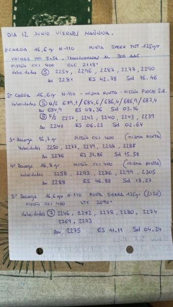 2164, 2181, 2160 esta ultima he conseguido una agrupación decente de tres disparos y la de 15,8 grs y 16 grs tambíen se han portado bien a 100 mts.