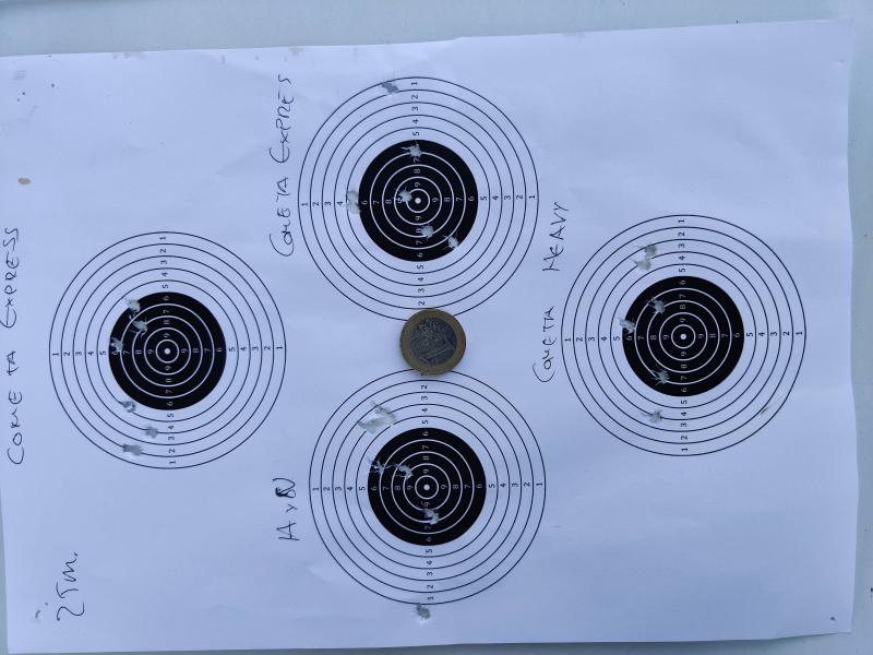 En la diana de arriba hay dos grupos de tres en un euro (2.3cm) lo que para esa distancia y esa carabina yo veo bien. Las demás creo que las prisas y el viento han hecho de las suyas, el express es un diábolo muy, muy ligero y un poco de brisa y adios...