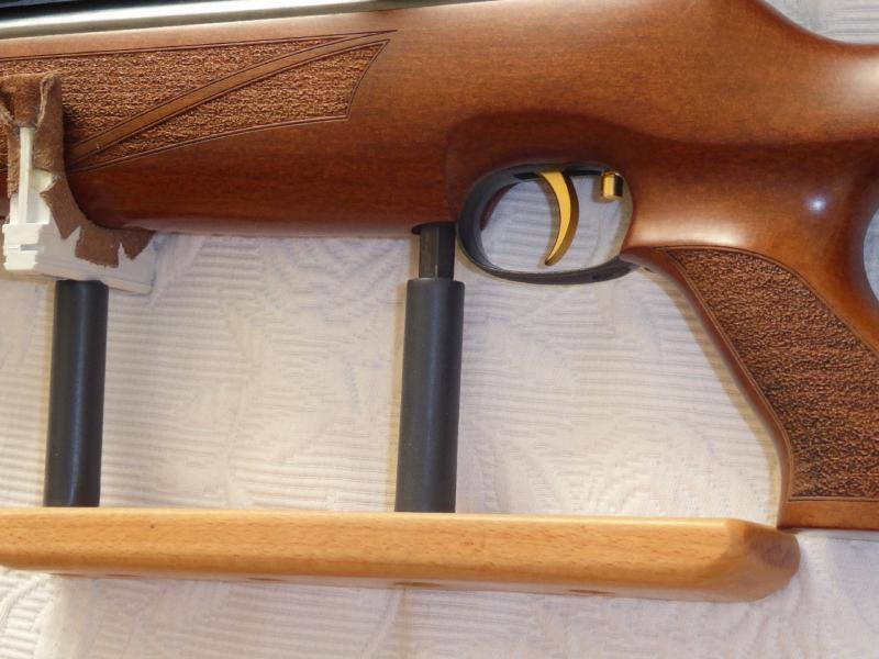 Después de intentar disparar erguido con la HW97KT, y sufrir sus 5.4Kg sobre mi brazo y cadera, decidí fabricarle una seta o palmrest en guiri, también llamado hamster.