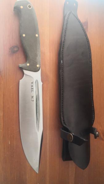 Cuchillo de 22 cm de hoja un grosor de 5'2 maiy ligero acero o1 con una micarta verde y separadores rojos y funda hecha a medida el cuchillo fue un diseño de un grupo de amigos se le puso el nombre de vael y se número su precio son 160 euros o cambio por algo me interese