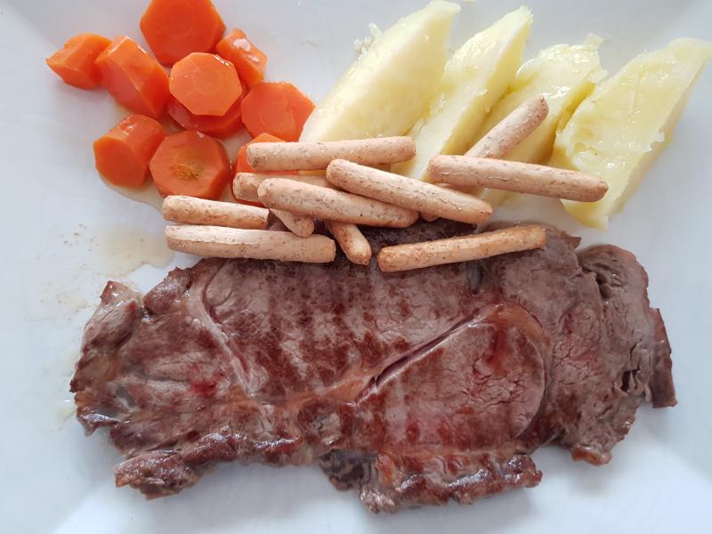 Entrecot de vacuno, guarnición de zanahorias y patata cocida.