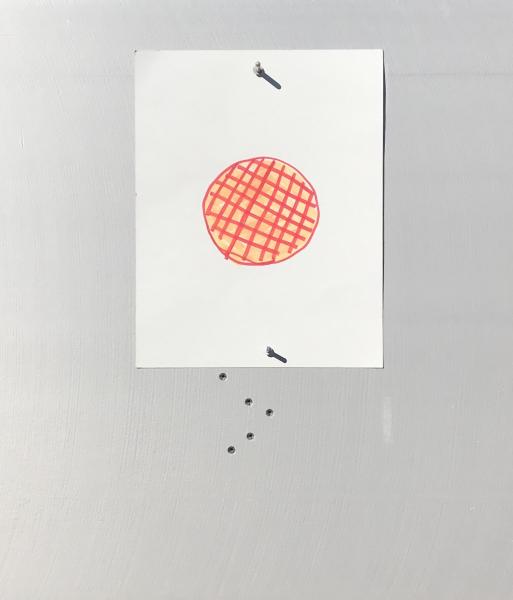Pongo una diana a 200 metros que al ser roja y amarilla y entrar desde una zona con sol , tardo unos minutos en ver con claridad. Disparo cinco cartuchos y voy a ver. Menuda seta si es comestible. La dejo claro.Bueno todos los impactos unos 20 y 26 cm debajo del 10 y con una distancia entre centros de seis cms.Un compañero que ha hecho una tirada muy buena me dice que tendría que corregir unos 20 clics. Me parece que caen mucho las balas a esta distancia. Otro día serà.